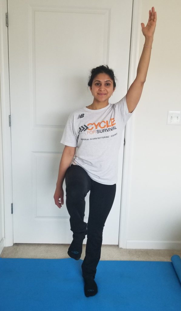 - Holding your back steady (you can always imagine there is book on top of your back and it should not fall), lift one arm up.