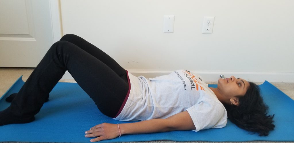 - Now slowly, lower one leg while holding the other leg up. Keep your knees bent, you do not need to straighten your knees.