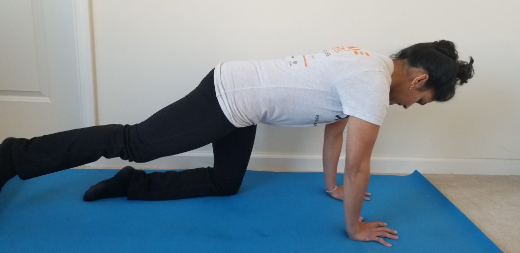 - Begin on your hands and knees. Make sure your hands are even in line with your shoulders and your knees are in the same line of your hips