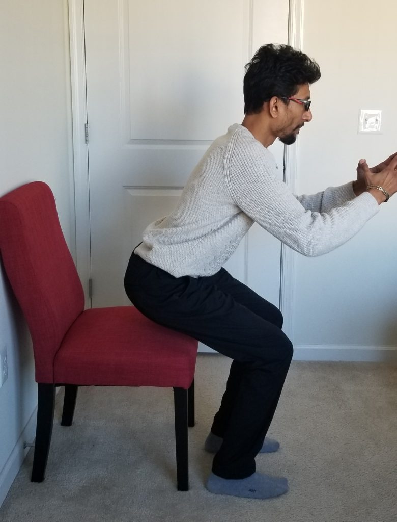 - Keeping your feet shoulder width apart, bend at the hips, slowly lower your buttock into the chair, as if you are planning to sit.